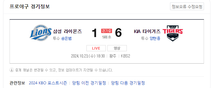 | 10월 22일 KBO 리그 한국시리즈 삼성 대 기아 (samsung vs kia) (1) | 2024.10.22 |