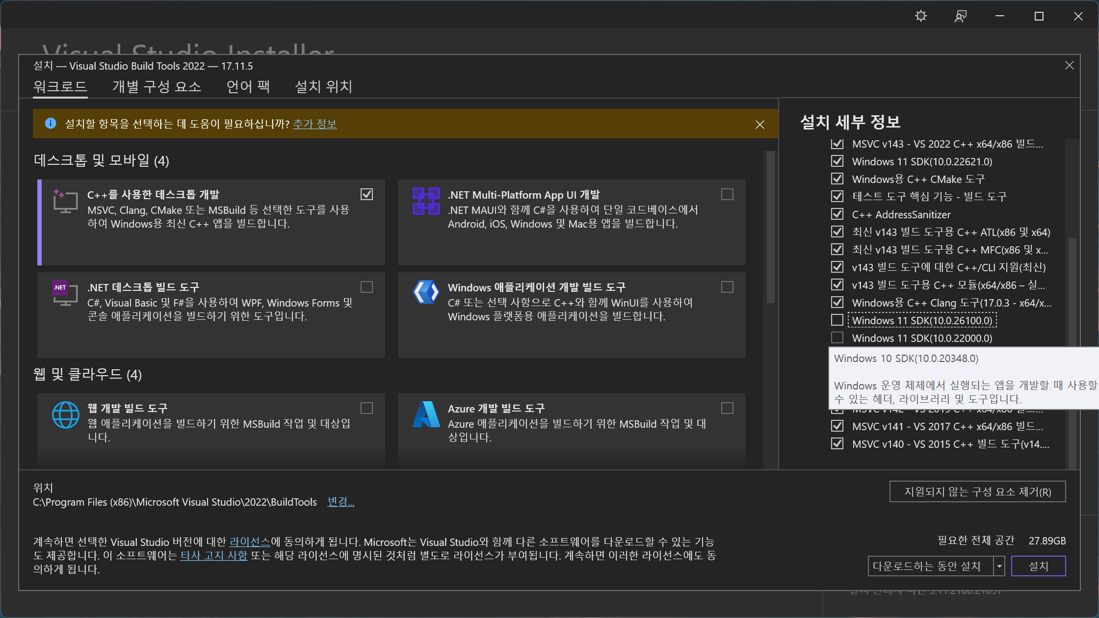 또한 v143 빌드 도구도 반드시 설치하시 바랍니다.