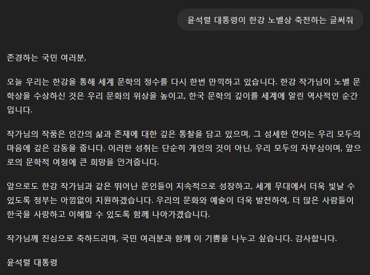 | 뉴스) 한강 이은 겹경사 김주혜, 윤대통령 축사, chatGPT AI축사 (2) | 2024.10.12 |